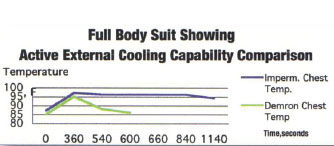 實驗條件:工作人員身穿不同防護服,以3.5英里/小時的速度在跑步機上慢跑10分鐘后測量全身防護服的溫度。藍色曲線代表通用防護服,綠色曲線代表使用Demron材料制成的防護服。