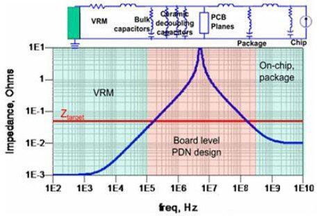 在調試該故障前先回顧下電源噪聲抑制的原理。如下圖所示,電源分配網絡中不同的頻段由不同的元件來抑制噪聲,去耦元件包含電源調整模塊(VRM)、去耦電容、PCB電源地平面對、器件封裝和芯片。VRM包含電源芯片及外圍的輸出電容,大約作用于DC到低頻段(100K左右),其等效模型是一個電阻和一個電感組成的二元件模型。去耦電容*好使用多個數量級容值的電容配合使用,充分覆蓋中頻段(數10K到100M左右)。由于布線電感和封裝電感的存在,即時大量堆砌去耦電容也難以在更高頻起到作用。PCB電源地平面對形成了一個平板電容,也具有去耦作用,大約作用在數十兆。芯片封裝和芯片負責高頻段(100M以上),目前的高端器件一般會在封裝上增加去耦電容,此時PCB上的去耦范圍可以降低到數十兆甚至幾兆。因此,在電流負載不變的情況下,我們只要判斷出電壓噪聲出現在哪個頻段,那么針對這個頻段所對應的去耦元件進行優化即可。在兩個去耦元件的相鄰頻段時兩個去耦元件會配合作用,所以在分析去耦元件臨界點時相鄰頻段的去耦元件也要同時納入考慮。