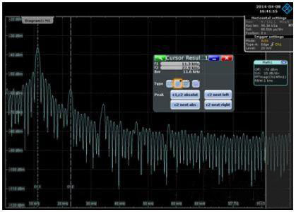 電源噪聲測量時不要求較高的采樣率,所以可以設置很長的時基,這也意味著采集的信號時間可以足夠長,可以認為覆蓋到了整個有效信號的時間跨度,此時不需要添加窗函數。調整以上設置可以得到比較準確的FFT變換曲線了,再通過zoom功能查看感興趣的頻點。如下圖中電源噪聲的主要能量集中在11.3KHz左右,并以該頻率為基波頻率諧振。據此可以推斷本PDN網絡在11.3KHz處的阻抗不能滿足要求,電容在該頻點的阻抗也比較高,起不到降低阻抗的作用,所以前面增加電容并不能減小電源噪聲。