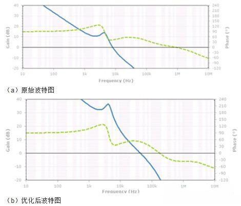 一般來說,11.3KHz應該是VRM的管轄范圍,此處出現較大噪聲說明VRM電路設計不能滿足要求。這里對VRM的性能進行分析,VRM分析的方法眾多,此處主要采用仿真其反饋環路波特圖的手段。波特圖主要觀察幾個關鍵信息:1、穿越頻率,增益曲線穿越0dB線的頻率點;2、相位裕度,相位曲線在穿越頻率處所對應的相位值;3、增益裕度,相位在-360°時所對應的增益值。這里我們主要關注穿越頻率和相位裕度這兩個指標。從VRM的環路波特圖(如下圖a)可以看到,VRM的穿越頻率在8KHz左右,相位裕度37度。這里存在兩個問題:首先VRM的相位裕度一般需要大于45度才能保證環路的穩定工作,這里相位裕度稍小一些,需要增加相位裕度;其次穿越頻率太低,穿越頻率附近VRM的調整作用逐漸降低,而此頻點bulk電容還起不到作用,所以在8KHz附近會存在較高的阻抗,這個頻點的噪聲抑制作用較差。下圖(b)是優化VRM環路之后的波特圖,調整相位裕度到50度,穿越頻率推到46KHz左右。