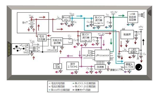 圖3中的每個電源都被顏色編碼以便區分,圖中*重要的部分是彩色標識的GND返回電流。因為多個電源是串聯的,導致每個*終負載和GND電流被迫以它們被加電時相同的順序去完成返回路徑。例如,電池為BUCK1.2V調節器加電,該調節器為微處理器供電。因此,流經微處理器的電流在返回到電池之前,將直接返回到BUCK1.2V調節器器GND端。如果未能預見到全部的電流回路和電流路徑完成的次序,*可能導致電路運行不穩定,或者沒有足夠的 GND電流返回,原因是這些問題沒有在電路布局中適當地考慮到并加以控制。