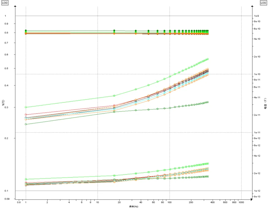 介質(zhì)譜分析測(cè)試的是各個(gè)不同頻率下的電容值和介損值,并繪制成電容和介損的頻率曲線。介質(zhì)譜曲線能夠更為清晰地反映絕緣的狀態(tài),并且有助于判斷測(cè)試結(jié)果是否存在異常。介損隨頻率改變,從左到右頻率逐次增大。可以看到,測(cè)試結(jié)果曲線與模型曲線十分平滑且基本一致。模型曲線與測(cè)試曲線有偏移的原因是溫度不同。